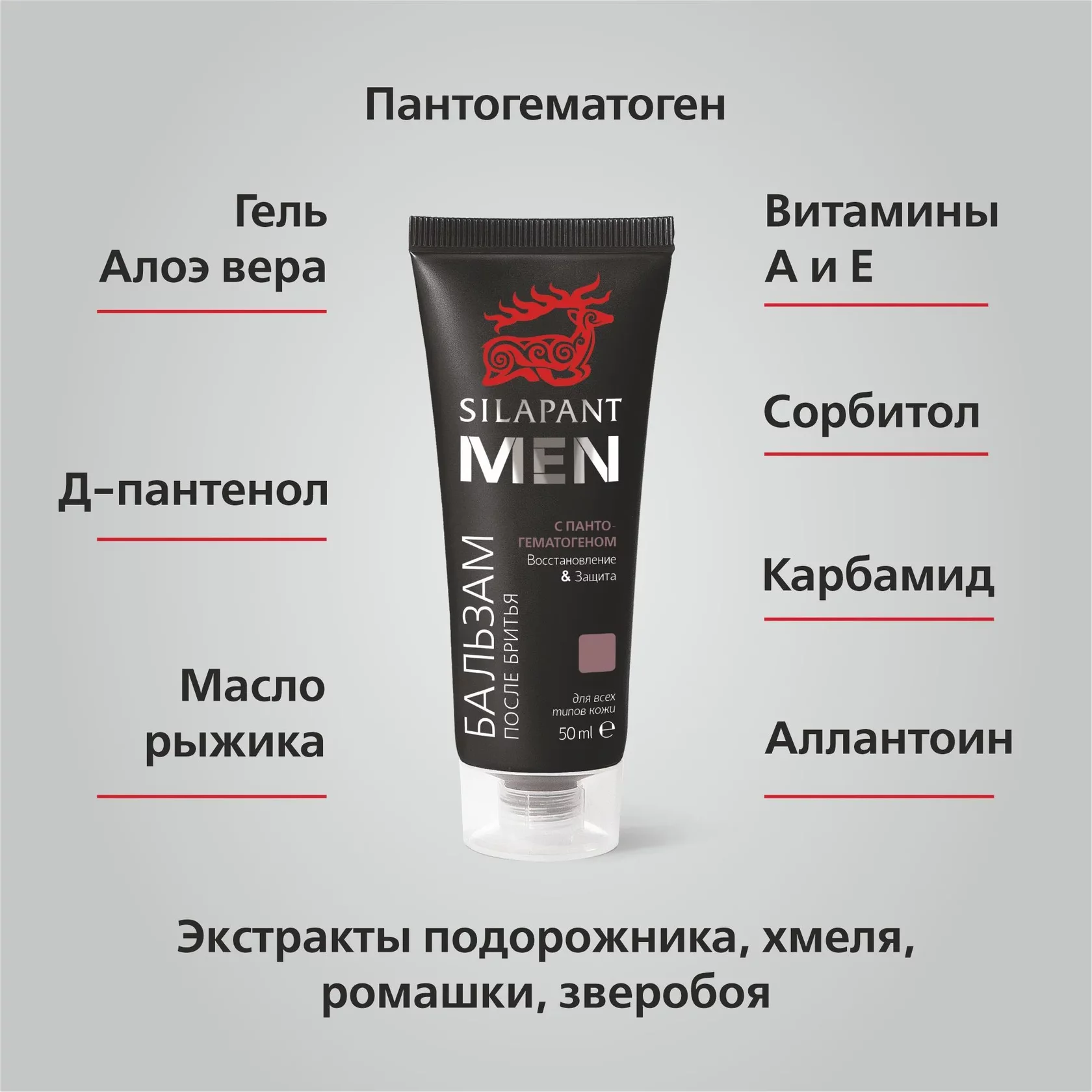 ОПИСАНИЕ: Каждый раз во время бритья ваша кожа испытывает огромный стресс. Это не зависит от качества бритвы или мастерства в бритье – раздражение и покраснение являются естественной реакцией кожи лица на механическое воздействие. Поэтому при выборе бальзама после бритья очень важно обращать внимание на его состав: в нем обязательно должны присутствовать смягчающие, ранозаживляющие компонента, масла и натуральные экстракты. Именно такое сочетание активных компонентов присутствует в бальзаме после бритья СИЛАПАНТ: — сорбитол, карбамид, витамин Е и аллантоин оказывают смягчающее воздействие, устраняют шелушение и сухость, активно питают кожу лица; — д-пантенол, зверобой, ромашка, подорожник и Алоэ вера заживляют порезы и микротрещины, снимают раздражение и покраснение, успокаивают кожу; — хмель, масло рыжика и пантогематоген стимулируют регенеративные процессы в коже на клеточном уровне, поддерживают здоровое кровообращение и укрепляют барьерную функцию кожи. — Бальзам после бритья СИЛАПАНТ быстро снимает даже самое сильное раздражение, надолго освежает кожу и придает ей ощущение свежести и комфорта.