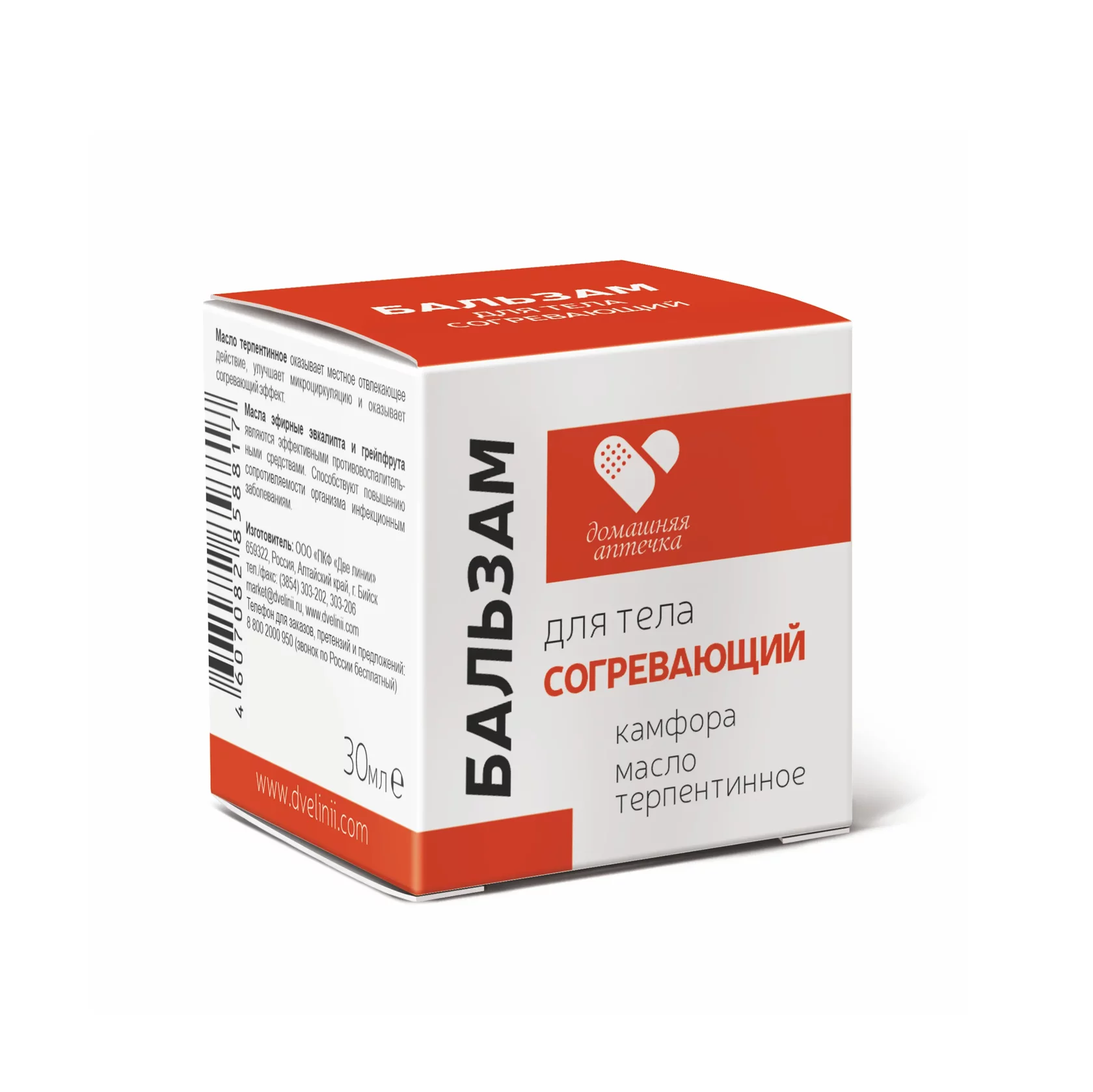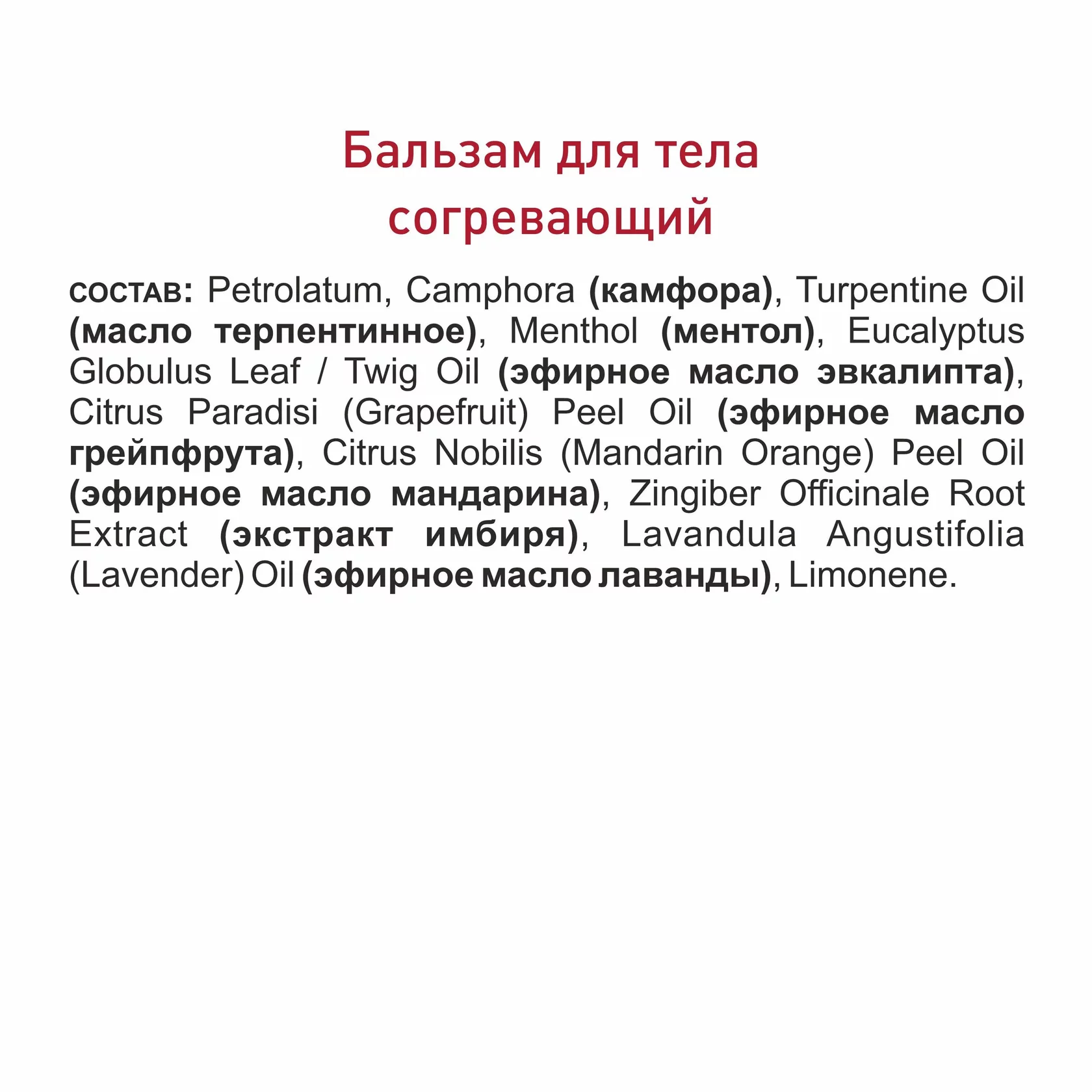 ОПИСАНИЕ: Бальзам согревающий для тела «Домашняя аптечка» Оказывает отвлекающее и разогревающее действия в местах нанесения. Может использоваться как вспомогательное средство при переохлаждении, для облегчения дыхания, а также для массажа тела в области мышц и суставов. Эфирные масла и растительные экстракты, входящие в состав бальзама, оказывают антисептическое, противовоспалительное и успокаивающее действия. Масло терпентинное оказывает местное отвлекающее действие, улучшает микроциркуляцию и оказывает согревающий эффект. Масла эфирные эвкалипта и грейпфрута являются эффективными противовоспалительными средствами. Способствуют повышению сопротивляемости организма инфекционным заболеваниям. Камфора оказывает раздражающее, антисептическое и обезболивающее действия. При местном нанесении обеспечивает отвлекающее воздействие. Экстракты лаванды и имбиря являются природным иммуностимулятором. Примечание: Не допускать попадания на поврежденные участки кожи, слизистые оболочки полости рта, глаз и носа. Противопоказания: индивидуальная непереносимость компонентов.