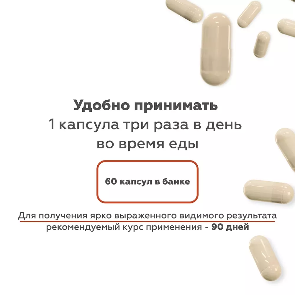 СПОСОБ ПРИМЕНЕНИЯ:В домашнем уходе Рекомендации по применению: взрослым по 1 капсуле 3 раза в день во время еды. Продолжительность приема: 1 месяц. При необходимости курс можно повторить. Возможны повторные приемы в течение года. Противопоказания: индивидуальная непереносимость компонентов, беременность, кормление грудью. Перед применением рекомендуется проконсультироваться с врачом.
