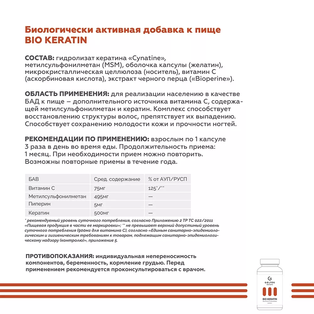 СОСТАВ:Состав: гидролизат кератина «Cynatine», метилсульфонилметан (MSM), оболочка капсулы (желатин), микрокристаллическая целлюлоза (носитель), витамин С (аскорбиновая кислота), экстракт черного перца («Bioperine»).