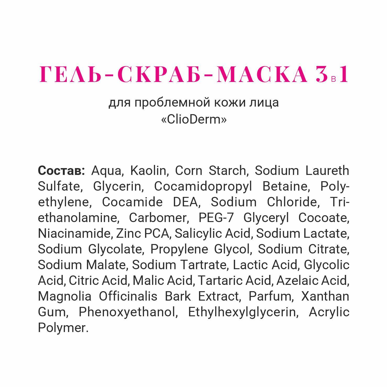 ОПИСАНИЕ: Каолин оказывает деликатное очищающее действие, мягко абсорбирует излишки себума, не пересушивая кожу. Ниацинамид способствует укреплению барьерной функции кожи, уменьшает трансэпидермальную потерю влаги, выравнивает тон. Цинк РСА — физиологический себорегулятор, предотвращает развитие микробных инфекций благодаря своим антисептическим свойствам. Азелаиновая кислота — это активный компонент для коррекции акне, свойства, которой проявляется в противовоспалительном действии. Экстракт магнолии — активное вещество против бактерий, вызывающих акне. Уменьшает покраснения кожи и противодействует воспалению. Салициловая кислота обладает антисептическими свойствами, эффективно стимулирует отшелушивание роговых чешуек кожи, мягко очищает поры, выравнивает микрорельеф кожи, предотвращая появление новых несовершенств. Комплекс фруктовых кислот : гликолевой, молочной, яблочной, лимонной, винной, обеспечивает натуральное увлажнение кожи, уменьшает гиперкератинизацию, способствует проникновению питательных веществ в глубь кожи.