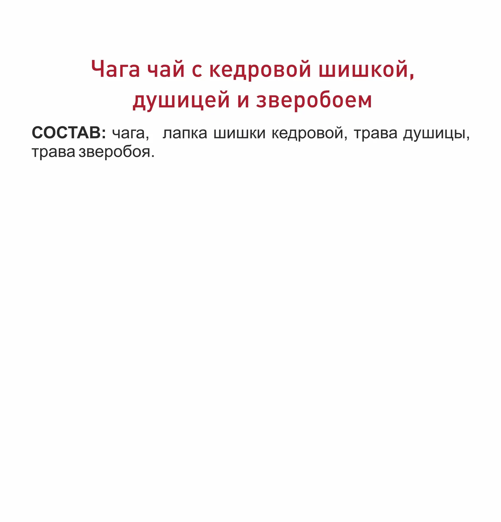 СОСТАВ:чага, лапка шишки кедровой, трава душицы, трава зверобоя.
