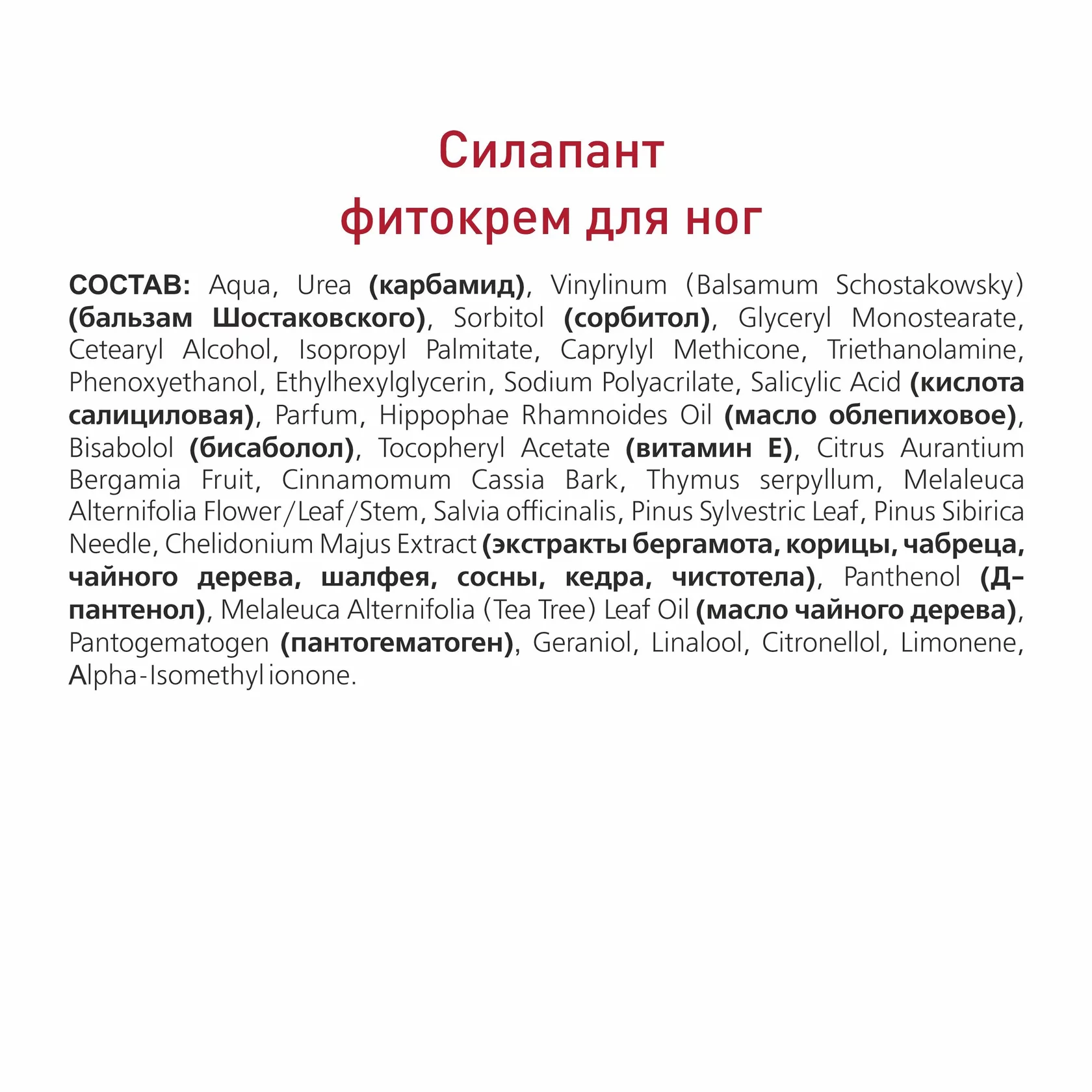 СОСТАВ: карбамид, бальзам Шостаковского, сорбитол, соевое масло, кислота салициловая, масло облепиховое, бисаболол, витамин Е, комплекс экстрактов бергамота, корицы, чабреца, чайного дерева, шалфея, сосны, кедра, чистотела, Д-пантенол, масло чайного дерева, пантогематоген.