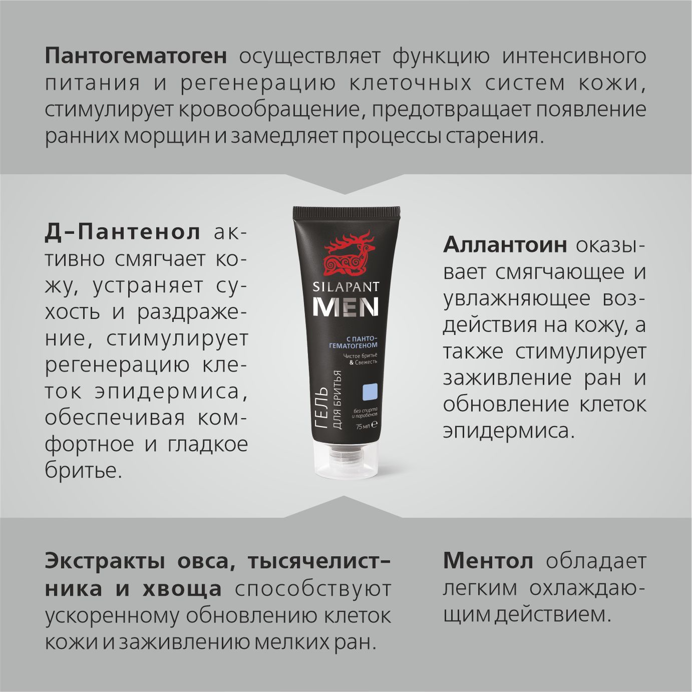 ОПИСАНИЕ: Гель для бритья с пантогематогеном СИЛАПАНТ не только обеспечивает комфортное и гладкое бритье, но и эффективно смягчает кожу лица, снимает раздражение, ускоряет заживление мелких порезов. К тому же, гель для бритья СИЛАПАНТ не образует пены, что позволяет всегда видеть линию бритья при уходе за разными типами бород и усов (эспаньолки, бакенбарды, бачки и т.д.) Активные компоненты геля (Д-пантенол, экстракты овса, тысячелистника, хвоща, аллантоин, ментол и пантогематоген) позволяют применять его ежедневно даже в том случае, если кожа лица склонна к сухости, раздражению или воспалена.