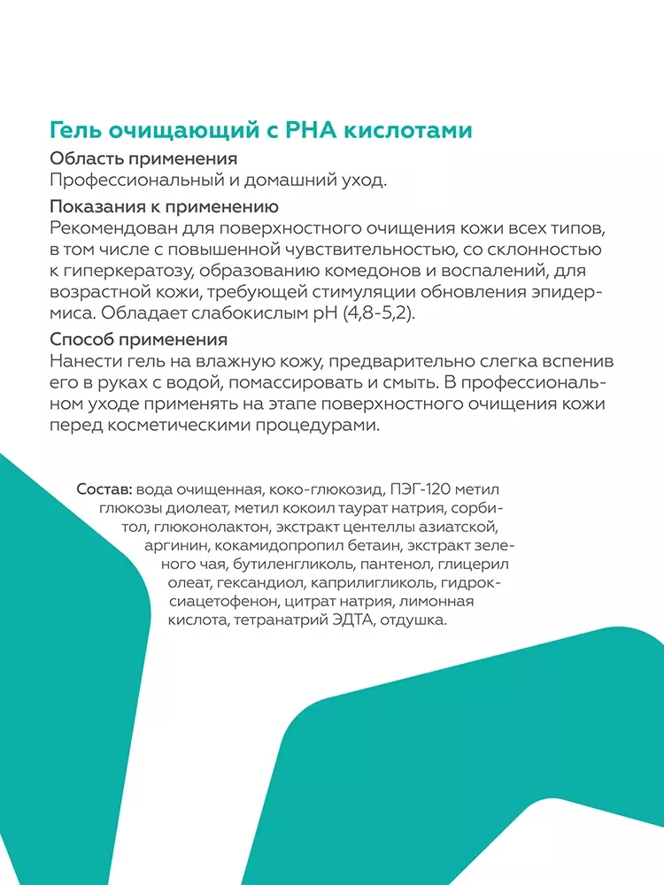 Рекомендован для умывания кожи всех типов, в том числе с повышенной чувствительностью, со склонностью к гиперкератозу, образованию комедонов и воспалений. А также для возрастной кожи, которая требует стимуляции обновления эпидермиса. Обладает слабокислым рН (4,8–5,2). PHA-кислоты (полигидроксикислоты) относятся к категории альфа-гидроксикислот (АНА), но имеют больший молекулярный размер. Это делает их менее агрессивными и подходящими для более чувствительной кожи. РНА-кислоты способствуют обновлению кожи без риска покраснения и раздражения, регулируют излишнюю секрецию кожного сала. Благодаря более медленному и постепенному действию PHA-кислот снижается риск пересушивания кожи. Также сохранению защитного гидролипидного барьера способствуют пантенол и мягкий ПАВ коко-глюкозид. Экстракты центеллы азиатской и зеленого чая успокаивают кожу.