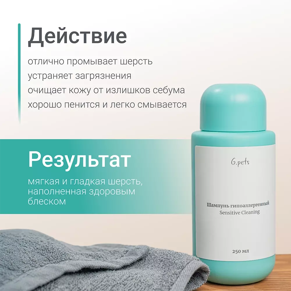 ОПИСАНИЕ: Шампунь для животных G.pets by Geltek Создан специально для бережного ухода за шерстью и кожей собак и кошек, включая животных, склонных к аллергии. Гипоаллергенный шампунь для животных подходит абсолютно всем — от маленьких щенков и котят до пожилых любимцев, бесшёрстных питомцев и тех, у кого кожа требует особого внимания. Его можно использовать даже для мытья морды, а его pH (6,0–7,0) идеально соответствует потребностям животных. Шампунь для питомцев деликатно и эффективно удаляет загрязнения и избыток себума, сохраняя естественную защиту кожи, улучшает внешний вид шерсти, делает её мягкой, блестящей и послушной. Можно использовать как шампунь для собак и как шампунь для кошек. Экстракты ромашки и лакрицы заживляют кожу, а Д-пантенол снимает раздражение.
