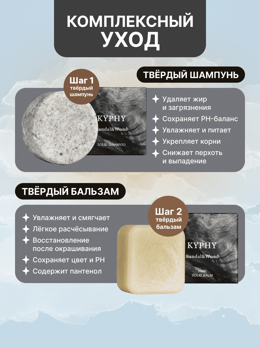 Этот комплекс твердого шампуня и бальзама KYPHY идеален для тех, кто ценит экологичный уход за волосами. Произведено в России без тестов на животных, без пластиковой упаковки, что делает его удобным в поездках и для спорта. Один набор заменяет несколько флаконов жидких средств, экономя место и ресурсы. Натуральный твердый шампунь для мужчин борется с избытком себума, не утяжеляя волосы, а бальзам усиливает эффект, смягчая и увлажняя. Подходит для всех типов волос, включая жирные и чувствительную кожу головы, сохраняя pH-баланс и продлевая цвет окрашенных волос.