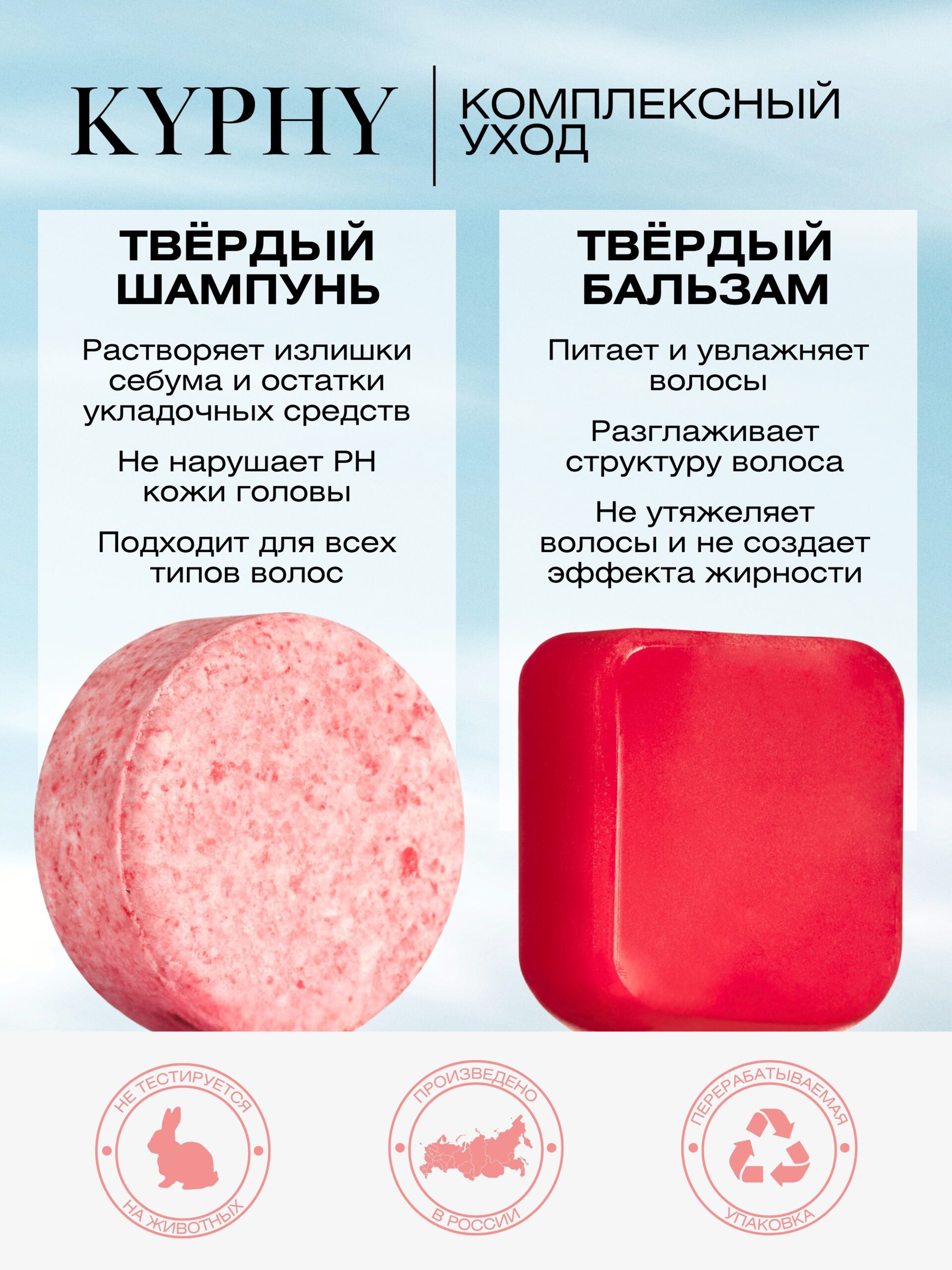 Комплекс KYPHY — это натуральный уход за волосами без компромиссов. В набор входят твердый шампунь и бальзам, которые бережно очищают, глубоко питают и помогают восстановить волосы по всей длине. Средства подходят для всех типов волос, включая чувствительную кожу головы, и особенно хороши для сухих, окрашенных, поврежденных и тусклых волос.