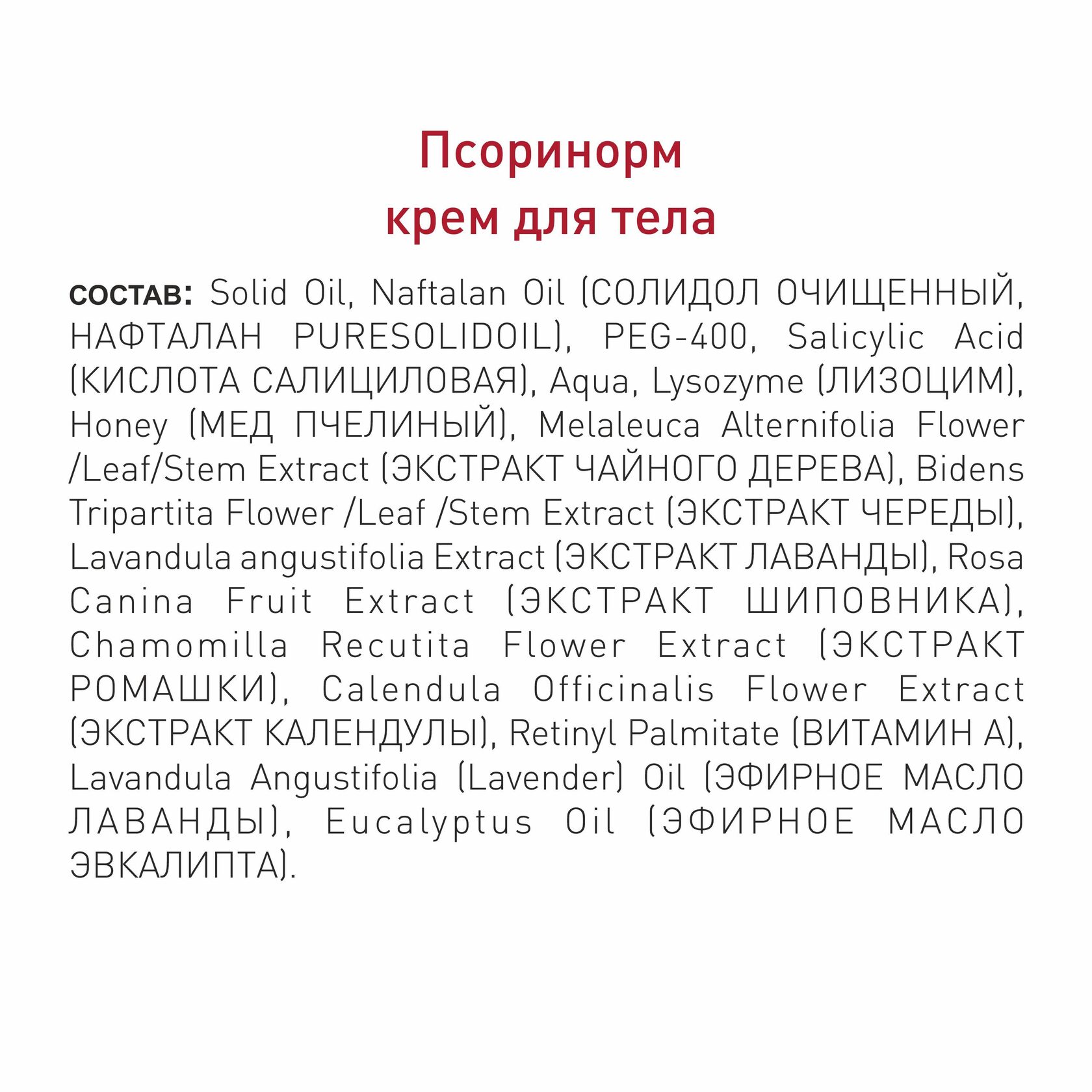ОПИСАНИЕ: Благодаря своему составу ПСОРИНОРМ работает сразу в трех направлениях: — эффективно справляется с основными симптомами псориаза (сухостью, покраснением, воспалением и зудом) — бережно очищает верхний слой кожи от ороговевших клеток — оказывает смягчающее и восстанавливающее воздействия на кожу в местах нанесения