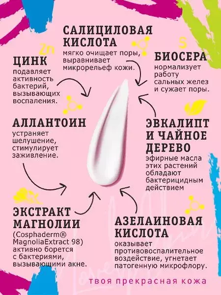 СОСТАВ: Aqua, Zinc Oxide, Cetearyl Alcohol, Glycerin, Isopropyl Alcohol, Petrolatum, Isopropyl Palmitate, Glyceryl Monostearate, Carbomer, Azelaic Acid, Stearic Acid, Allantoin, Sulfurized TEA-Ricinoleate, PEG-35 Castor Oil, Propylene Glycol, Magnolia Officinalis Bark Extract (Cosphaderm® Magnolia Extract 98), Melaleuca Alternifolia Essential Oil, Eucalyptus Oil, Salicylic Acid, Ceteareth-20, Triethanolamine, PEG-40 Hydrogenated Castor Oil, Parfum, Xanthan Gum, Ethylhexylglycerin, Phenoxyethanol, EDTA.
