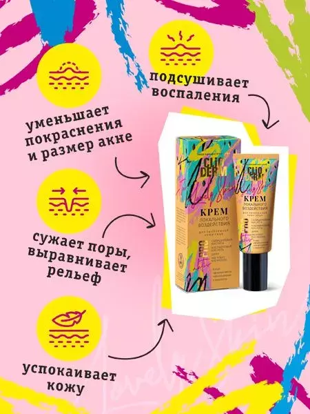 СПОСОБ ПРИМЕНЕНИЯ: наносить крем точечно на проблемные участки (акне) легкими, вбивающими движениями кончиков пальцев, до полного впитывания. Рекомендуется использовать крем по мере возникновения проблемы.