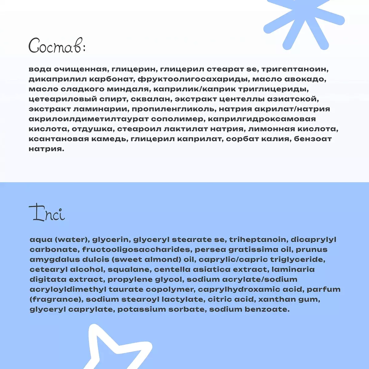 СОСТАВ:вода очищенная, глицерин, глицерил стеарат SE, тригептаноин, дикаприлил карбонат, фруктоолигосахариды, масло авокадо, масло сладкого миндаля, каприлик/каприк триглицериды, цетеариловый спирт, сквалан, экстракт центеллы, экстракт ламинарии, пропиленгликоль, натрия акрилат/натрия акрилоилдиметилтаурат сополимер, каприлгидроксиаминовая кислота, отдушка, стеароил лактитат натрия, лимонная кислота, ксантановая камедь, глицерил каприлат, сорбат калия, бензоат натрия. INCI: Aqua, Glycerin, Glyceryl Stearate SE, Triheptanoin, Dicaprylyl Carbonate, Fructooligosaccharides, Persea Gratissima Oil, Prunus Amygdalus Dulcis (Sweet Almond) Oil, Caprylic/Capric Triglyceride, Cetearyl Alcohol, Squalane, Centella Asiatica Extract, Laminaria Digitata Extract, Propylene Glycol, Sodium Acrylate/Sodium Acryloyldimethyl Taurate Copolymer, Caprylhydroxamic Acid, Parfum, Sodium Stearoyl Lactylate, Citric Acid, Xanthan Gum, Glyceryl Caprylate, Potassium Sorbate, Sodium Benzoate.