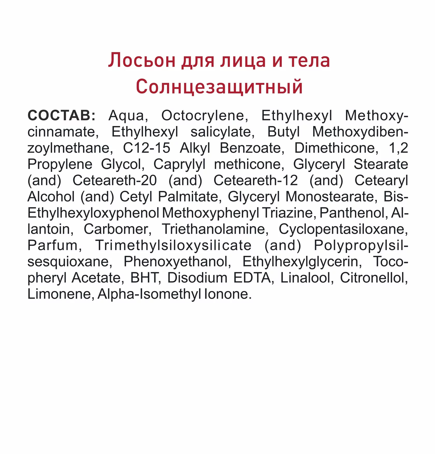 ОПИСАНИЕ: Активный состав лосьона эффективно защищает от негативного воздействия UVA/UVB лучей. Подходит для всех типов кожи, особенно светлой и чувствительной, не оставляет белых следов и ощущения липкости. Дополнительно увлажняет и смягчает кожу, делает ее более эластичной и снимает раздражение.