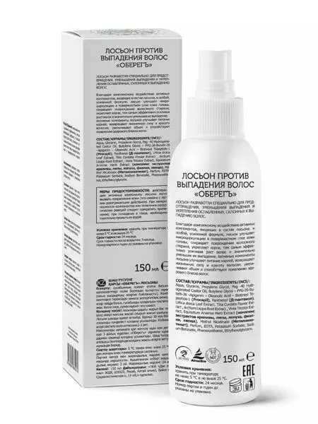 ОПИСАНИЕ: Лосьон «ОБЕРЕГЪ», благодаря усиленной формуле, улучшает микроциркуляцию в поверхностном слое кожи головы, сокращает повреждение волосяного стержня, укрепляет корни, тем самым эффективно усиливая рост волос и значительно уменьшая их выпадение. Активные компоненты лосьона «ОБЕРЕГЪ» улучшают питание корней, возвращают жизненную силу и красоту волосам; увеличивают объем и способствуют появлению здорового блеска волос.