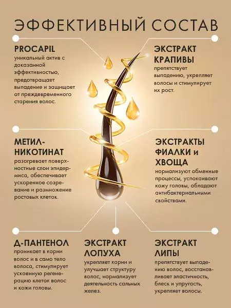 СОСТАВ: Procapil, Д-пантенол, комплекс экстрактов крапивы, липы, лопуха, фиалки, хвоща, Метилникотинат.