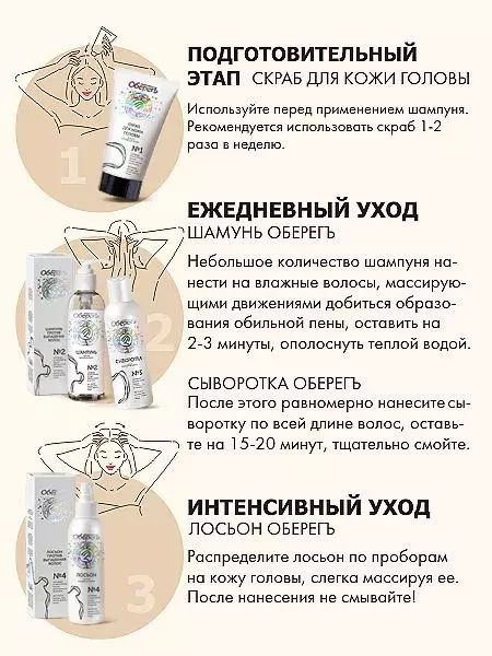 СПОСОБ ПРИМЕНЕНИЯ: распределите лосьон по проборам на кожу головы, слегка массируя. Лосьон не требует смывания. На протяжении первых 30 дней рекомендуется использование лосьона ежедневно. Затем, для закрепления эффекта – 2-3 раза в неделю. Для достижения максимального результата рекомендуется применять средства серии «Оберегъ» в комплексе курсами, продолжительностью не менее 3-х месяцев. Применение средств при первых признаках выпадения волос заметно увеличивает вероятность достижения положительного эффекта.