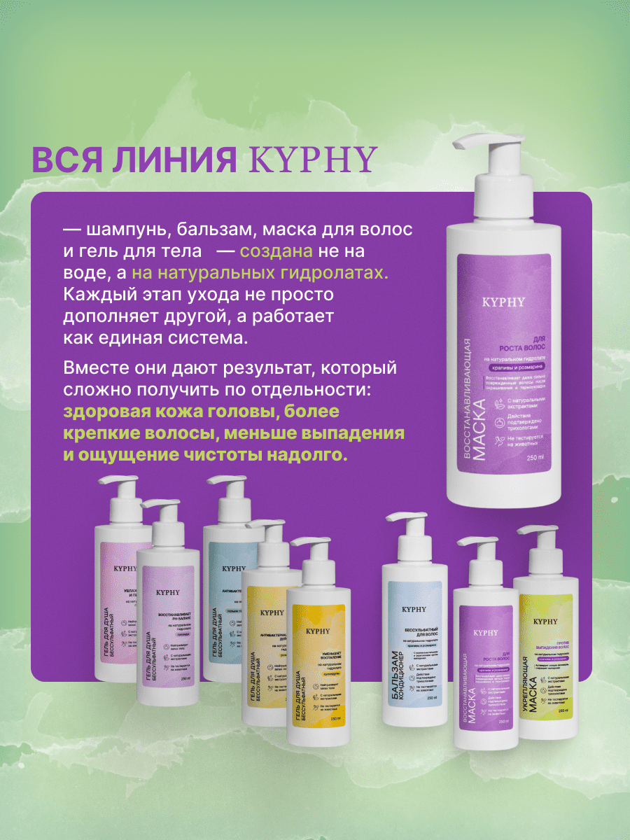 Шампунь KYPHY не содержит искусственных красителей и ароматизаторов, пальмового масла, SLS, SLES, парабенов, кокамида и силикона. Полное описание →