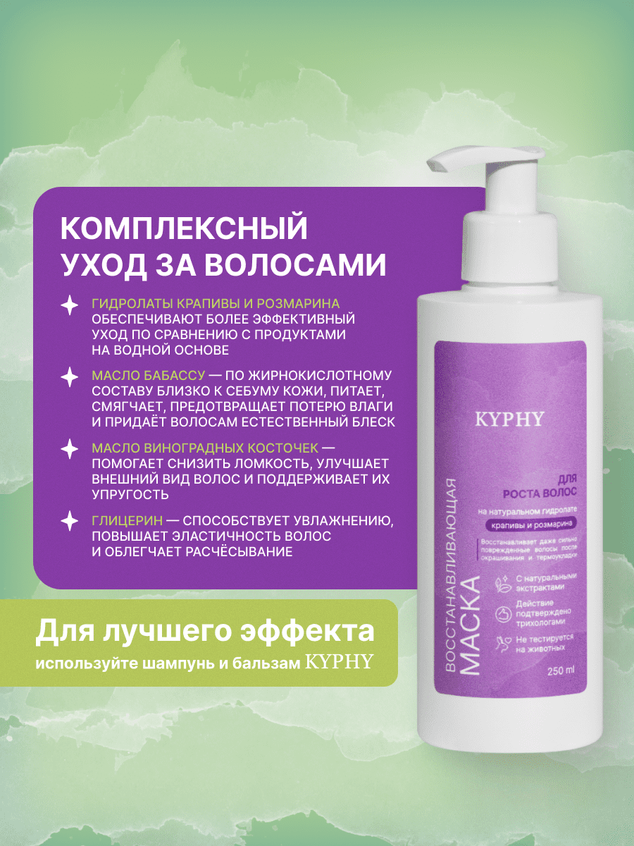 Восстанавливающая маска разработана специально для стимулирования естественного роста волос. Благодаря своему уникальному составу, основанному на натуральном гидролате крапивы и розмарина, маска активно воздействует на волосяные фолликулы и улучшает микроциркуляцию крови в коже головы, способствуя быстрому росту крепких и блестящих волос. Ускоренное обновление клеток стимулирует рост густых и сильных волос.