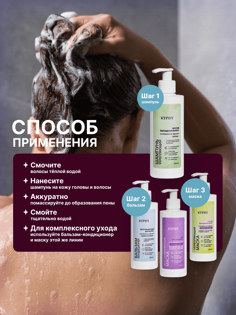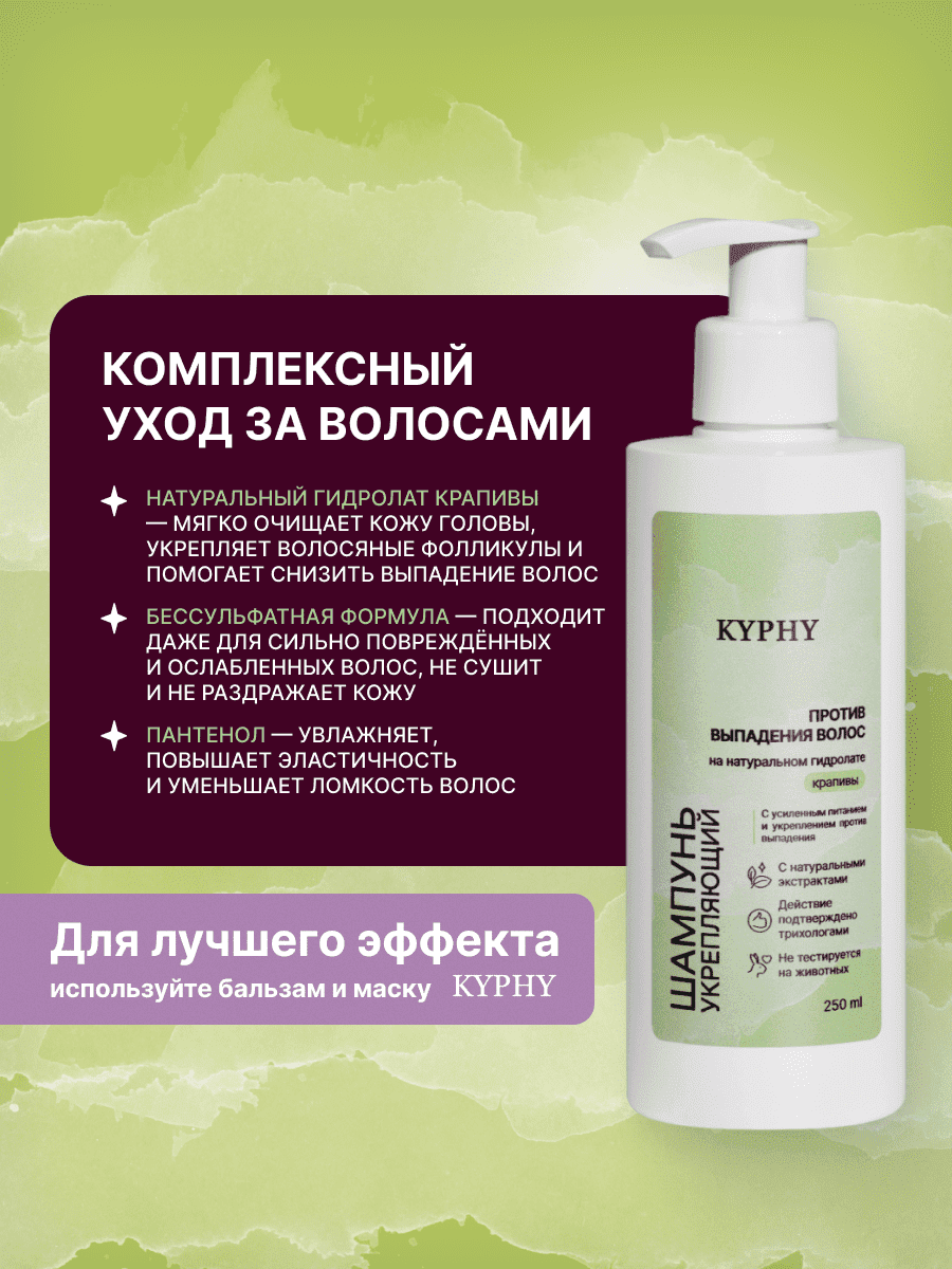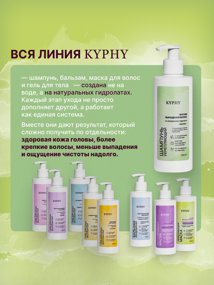 Шампунь KYPHY не содержит искусственных красителей и ароматизаторов, пальмового масла, SLS, SLES, парабенов, кокамида и силикона. Полное описание →