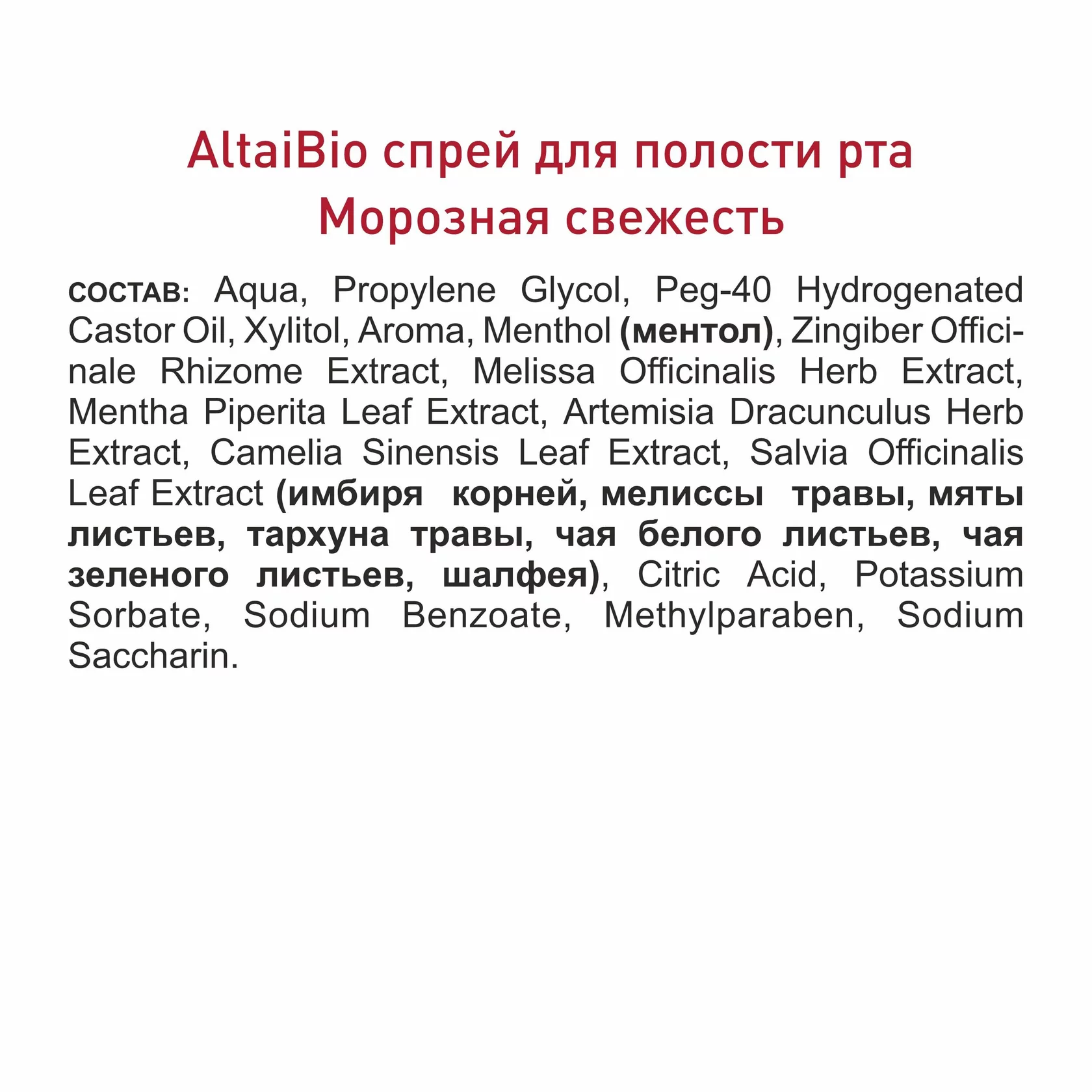 ОПИСАНИЕ: Обладает приятным ароматом морозной свежести и быстро избавляет от неприятного запаха изо рта. Активные компоненты спрея характеризуются противовоспалительным, антимикробным действиями. Уменьшает ощущение послевкусия после приема пищи, курения. Ментол придает длительную мятную свежесть, обеспечивает охлаждающее действие. Экстракты мяты, мелиссы, эстрагона, имбиря, шалфея освежают, обладают антиоксидантным и бактерицидным действиями. Экстракт белого и зеленого чая характеризуется дезодорирующим действием, противокариесной и противовирусной активностью.