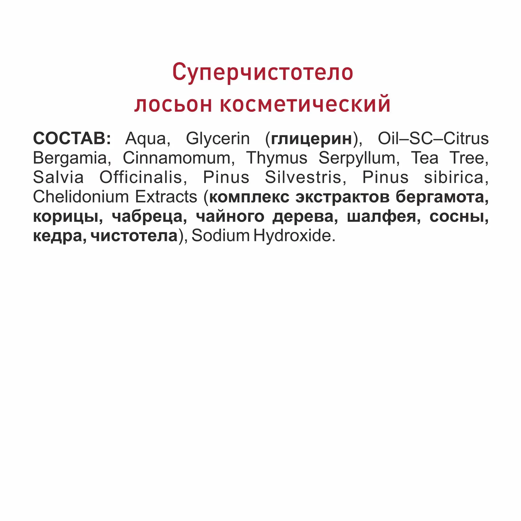 СОСТАВ: вода очищенная, глицерин, комплекс экстрактов бергамота, корицы, чабреца, чайного дерева, шалфея, сосны, кедра, чистотела, натрия гидроксид.