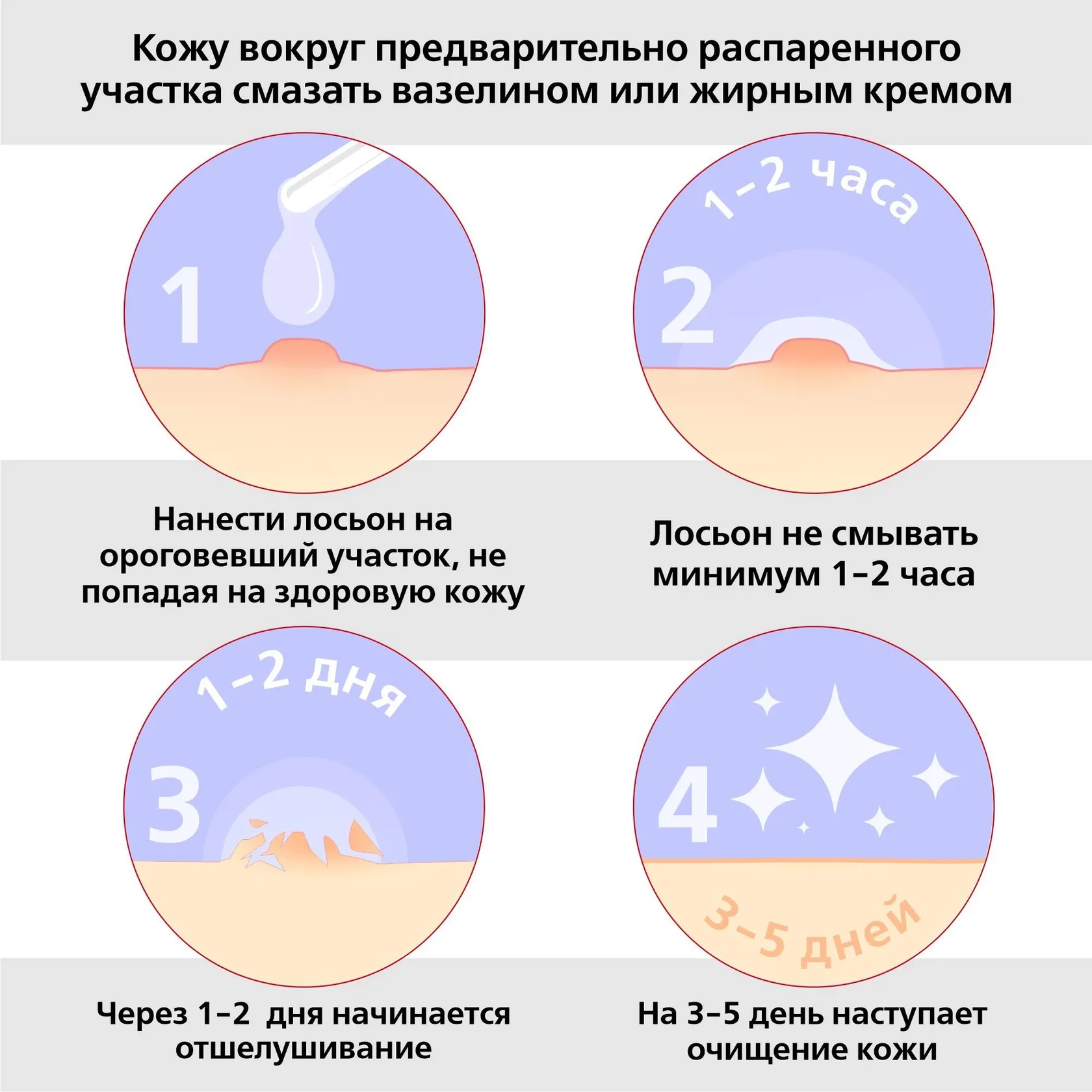 СПОСОБ ПРИМЕНЕНИЯ: 1. Кожу вокруг проблемных мест смазать вазелином или жирным кремом. 2. Полностью смочить ороговевший участок кожи (бородавку, папиллому) кончиком аппликатора, не попадая на здоровую кожу. Средство не смывать минимум 1-2 часа, по возможности оставить на более длительное время. После впитывания средства излишки крема, нанесенного для защиты здоровой кожи, можно пропитать салфеткой. 3. Через 1-2 дня начинается отшелушивание ороговевших участков кожи и на 3-5 день – их очищение. При необходимости можно провести повторную процедуру, но не ранее чем через 3 дня после первого нанесения «Суперчистотело». На курс потребуется от одной до пяти процедур. *Кожа с избыточным ороговением – папилломы, бородавки.