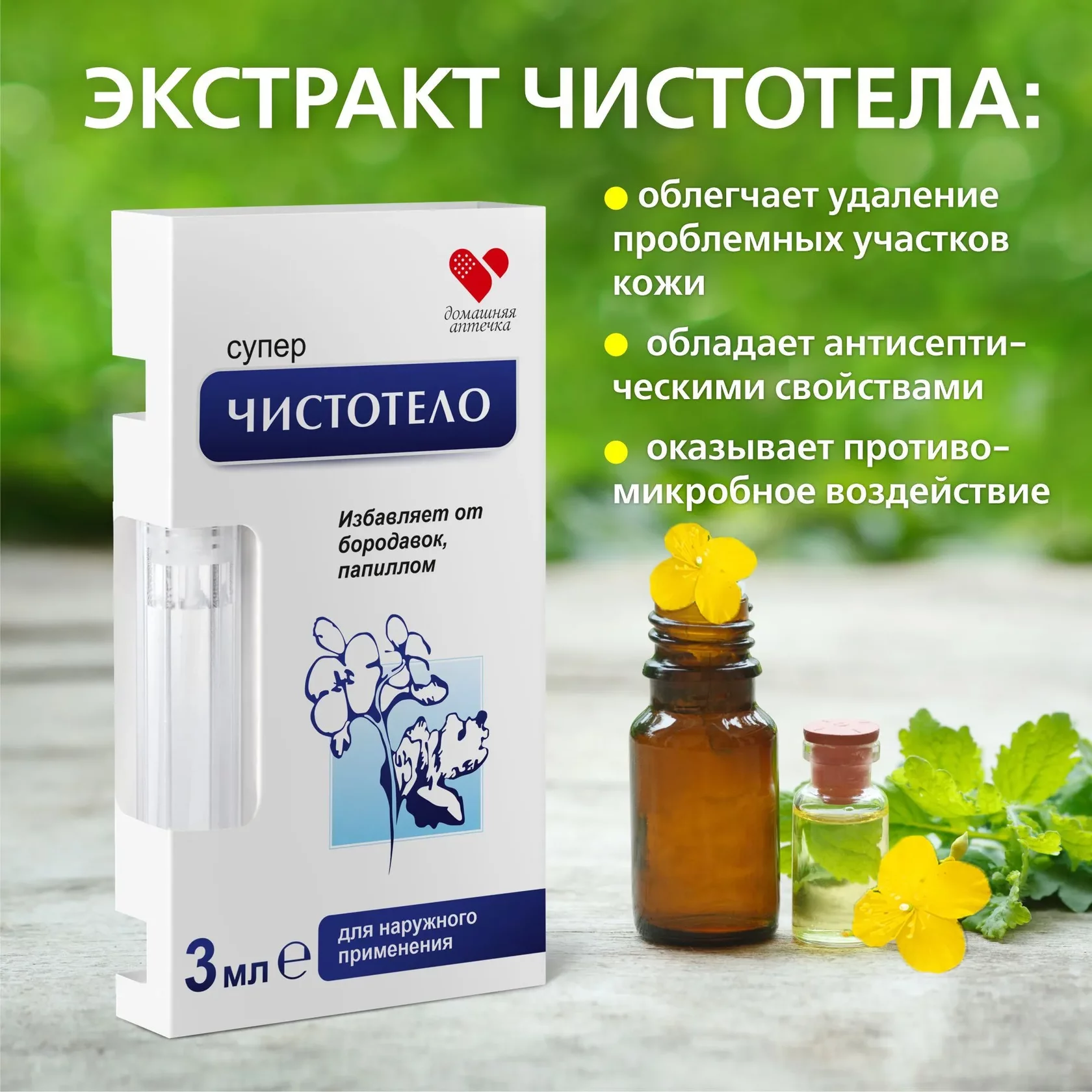 ОПИСАНИЕ: Для быстрого удаления бородавок и папиллом в комфортных домашних условиях создано средство «Суперчистотело», обладающее местным отшелушивающим действием. Полное описание →