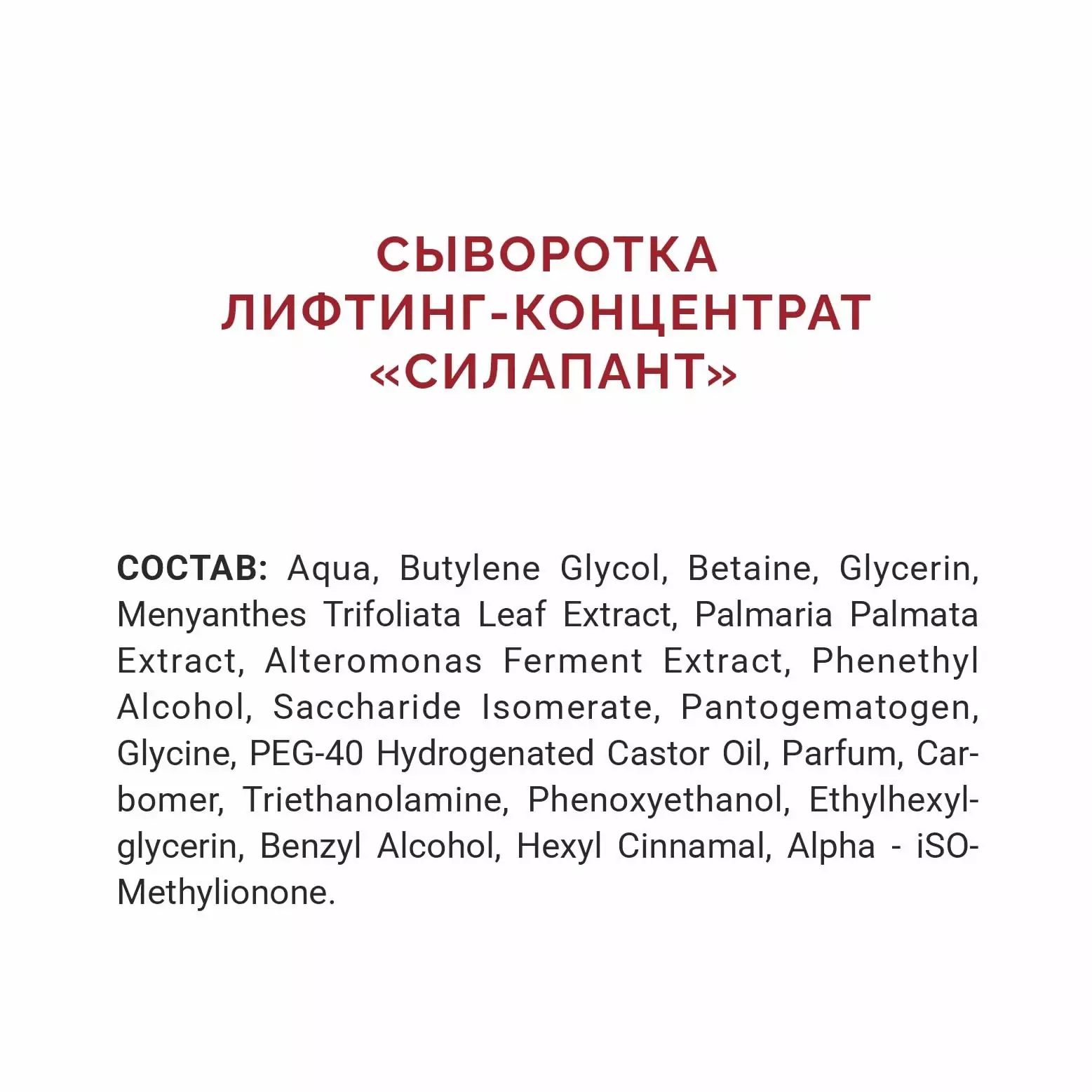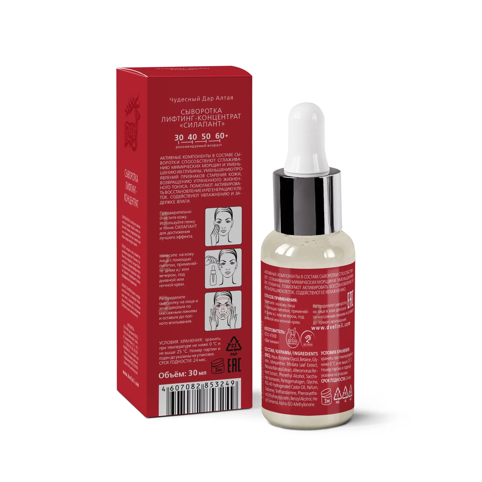 СПОСОБ ПРИМЕНЕНИЯ: Предварительно очистите кожу лица. Используйте пенку и тоник «Силапант» для достижения лучшего эффекта. Нанесите сыворотку на лицо с помощью пипетки (наносить днем и/или вечером, можно под дневной или ночной крем). Распределите сыворотку на лице и зоне декольте по массажным линиям и оставьте до полного впитывания.