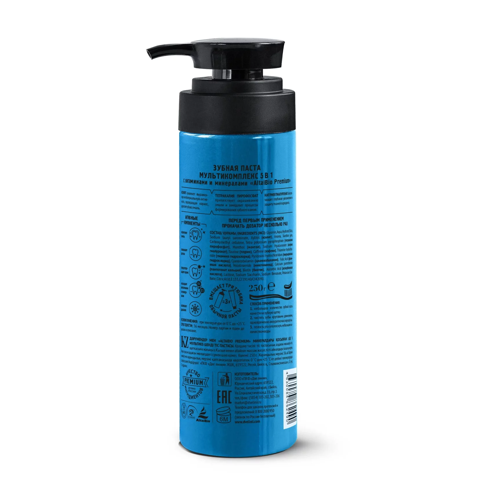ОПИСАНИЕ: Богатый состав витаминно-минеральной зубной пасты ALTAI BIO PREMIUM позволяет ей активно воздействовать сразу в пяти направлениях: — осветляет эмаль; — защищает десна; — предотвращает кариес; — насыщает ткани витаминами и минералами; — освежает дыхание.